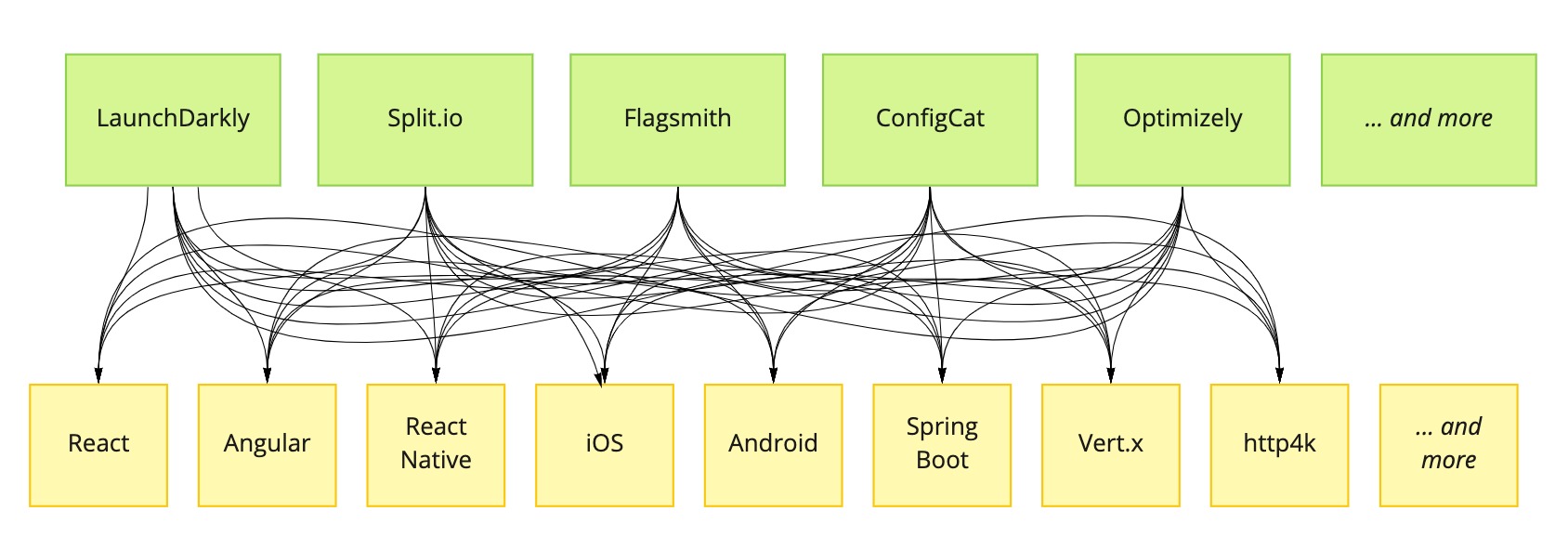 My hope is that OpenFeature will do the same for feature flagging. This can happen at two levels. Firstly, OpenFeature will provide a single target for framework-specific feature flag evaluation, which can be done in a really idiomatic, ergonomic way. For example, a React feature flagging client can provide flag evaluation mechanisms using hooks, providers and components, rather than plain old Javascript functions. This idiomatic addition is an example which various vendors have made already, but such ergonomic improvements are spread across each vendor-specific library, and frankly none of them are perfect. If we could get to a single, vendor-neutral library then engineering effort could be focused in one place, and users of the client would not need to re-learn a slightly different API for each vendor. This same situation applies for every runtime that needs feature flag evaluation - we can build a single, standard feature flag evaluation client for Android, React Native, iOS, Spring Boot, Elixir, Django, Fastify, Vertx, gin, and so on. And each of these clients can provide a rich, idiomatic API that provides a great developer experience in each of these frameworks.